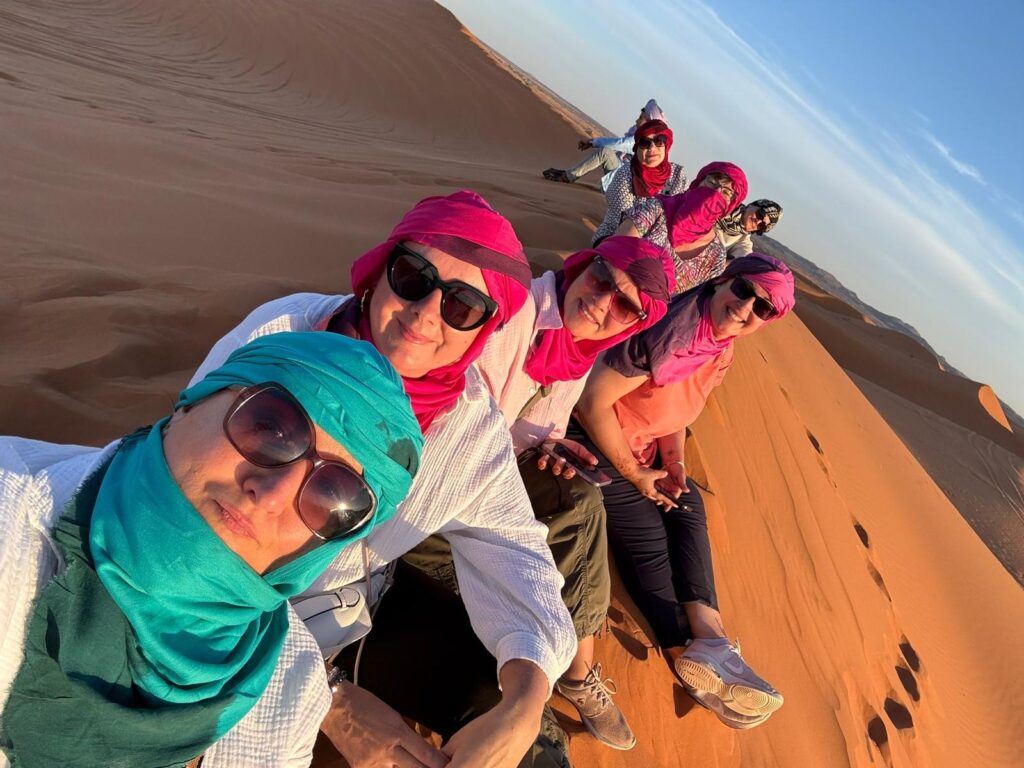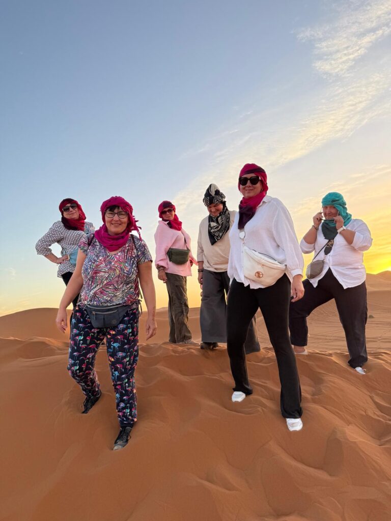 Podróż minęła szybko i już byłyśmy u progu Sahary. Dosłownie, bo zaczynała się tuż za płotem. Tu odpoczynek, spacery w poszukiwaniu pasących się wokół dromaderów, basen, sesja foto na pustyni i ruszyłyśmy naszą własna karawaną na pustynię! Jechałyśmy na wielbłądach! W kolorowych turbanach, w słońcu, w bezkresnym piachu, nie do uwierzenia!
